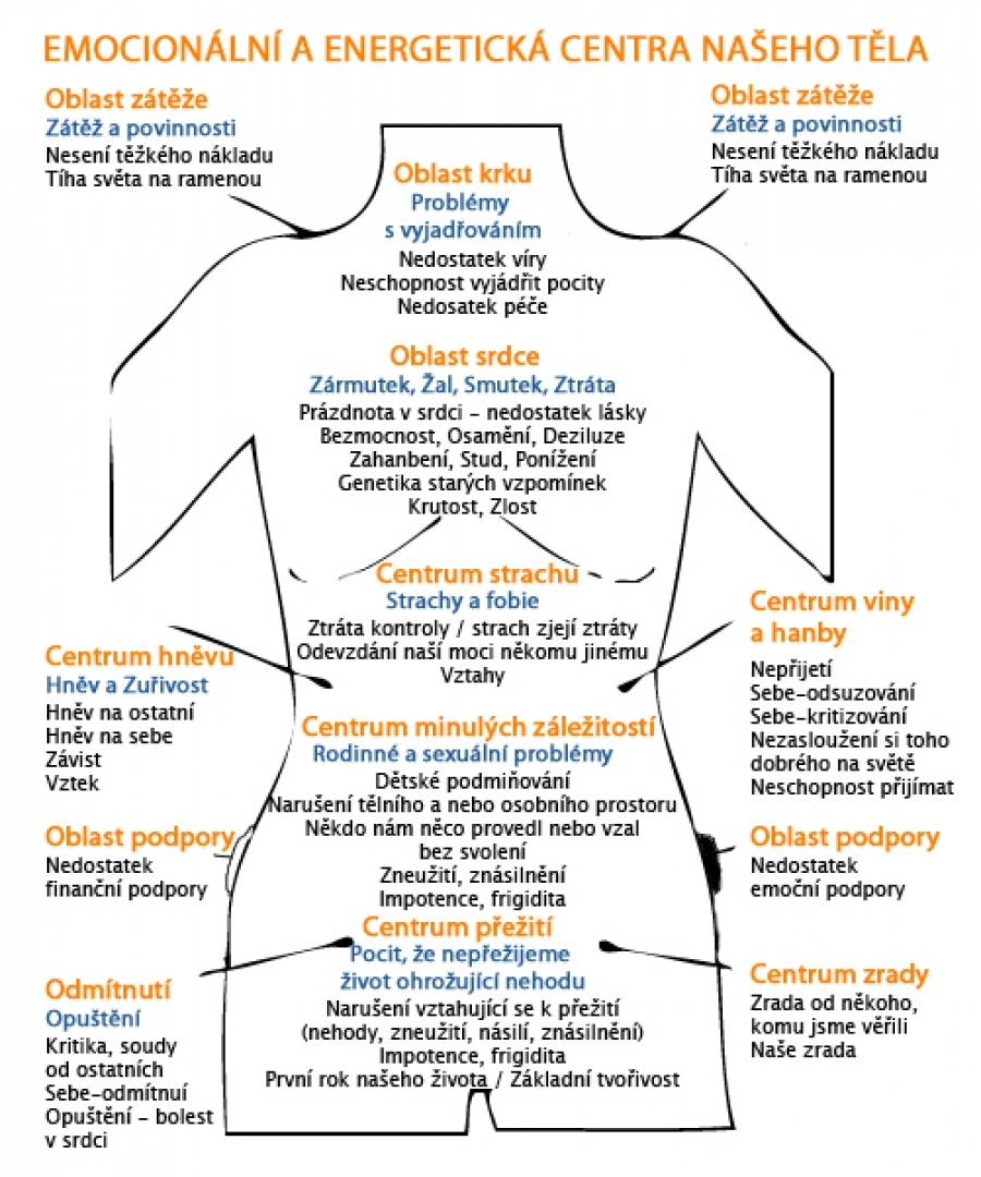 Připravil jsem si pro vás takový ilustrační obrázek, který vám může o některých vašich fyzických problémech v mnohém napovědět. Není zdaleka komplexní, ale seznámí vás s jistými centry na těle, kde se obecně projevují jisté druhy emocí a podle nich se bude snáz hledat vaše příčina.